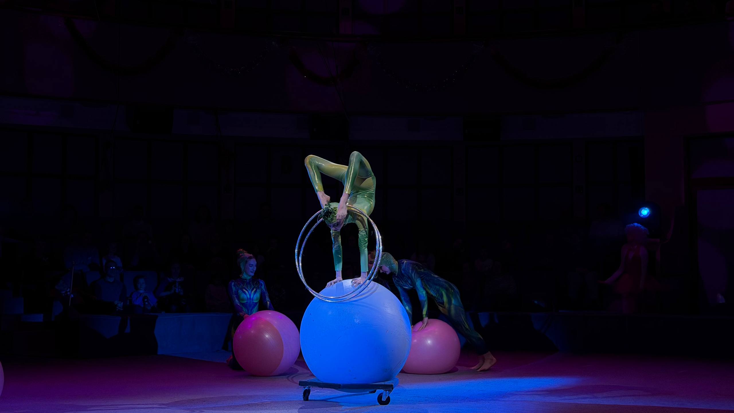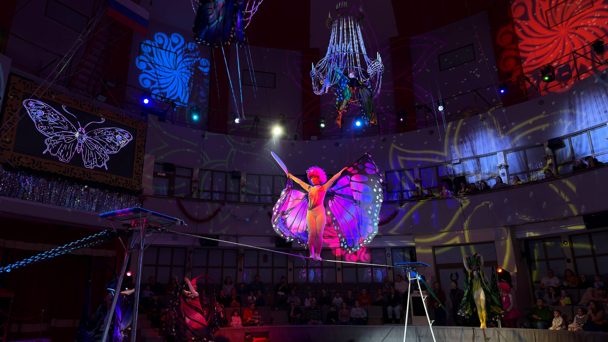 Зрители с восторгом наблюдали за красочным представлением с участием талантливых студентов 1-го курса: смелые акробатические трюки, яркие гимнастические номера, зажигательные жонглёрские этюды не оставили равнодушным ни одного зрителя. Волшебная новогодняя музыка, яркие декорации и сияющие огни создали по-настоящему сказочное настроение.